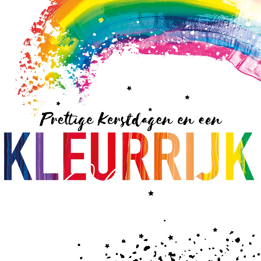Kerstkaart met regenboog verf en zilverfolie. Liever toch een andere kleur folie? Je kunt dit gemakkelijk zelf aanpassen door bij kleur de folie te kiezen die je wilt. Let op: Deze kaart heeft een langere verzendtijd: voor 18.00 uur besteld = de volgende werkdag gedrukt en verzonden. Minimale bestelhoeveelheid: 5 stuks.