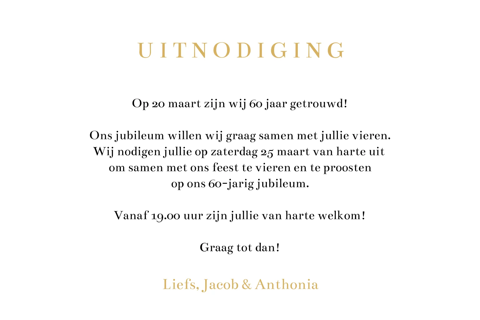 Jubileumkaart botanisch 60 jaar getrouwd met goudfolie. Liever toch koper- of zilverfolie? Je kunt dit gemakkelijk zelf aanpassen door op de naam te klikken en bij kleur de folie te kiezen die je wilt. Let op: Deze kaart heeft een langere verzendtijd: voor 18.00 uur besteld = de volgende werkdag gedrukt en verzonden. Minimale bestelhoeveelheid: 5 stuks.