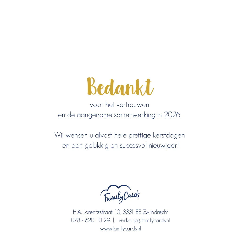 Donkerblauwe kerstkaart met goudfolie elementen. Liever toch een andere kleur folie? Je kunt dit gemakkelijk zelf aanpassen door bij kleur de folie te kiezen die je wilt. Let op: Deze kaart heeft een langere verzendtijd: voor 18.00 uur besteld = de volgende werkdag gedrukt en verzonden. Minimale bestelhoeveelheid: 5 stuks.