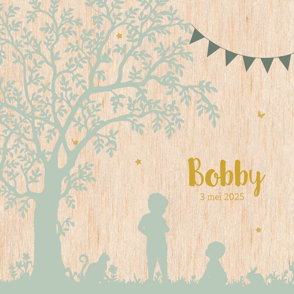 Hip geboortekaartje silhouet van boom en grote broer met klein broertje op echt (berken)hout.