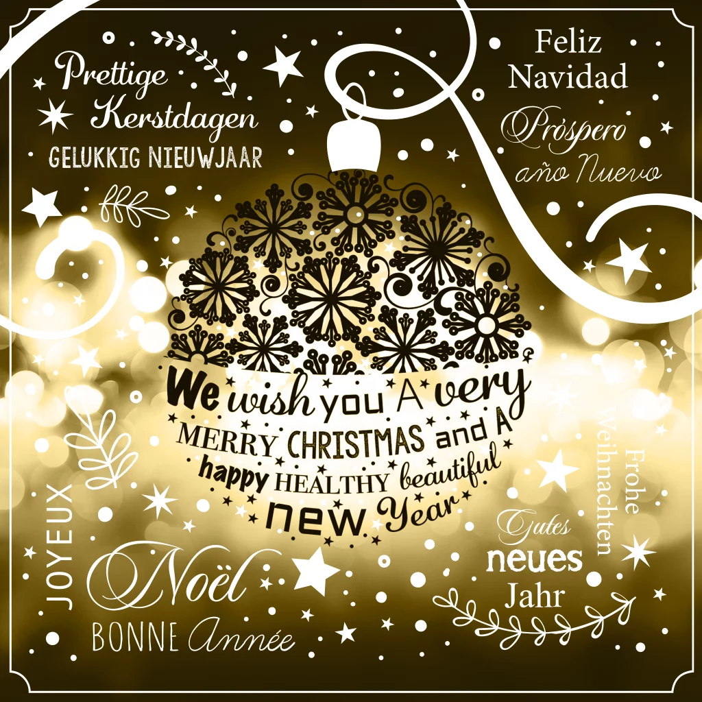 Goudkleurige kerstkaart met kerstbal en kerstwensen. Personaliseer de binnenkant van de kerstkaart met een feestelijke kerstgroet! Tip: kies een bijpassende envelop.