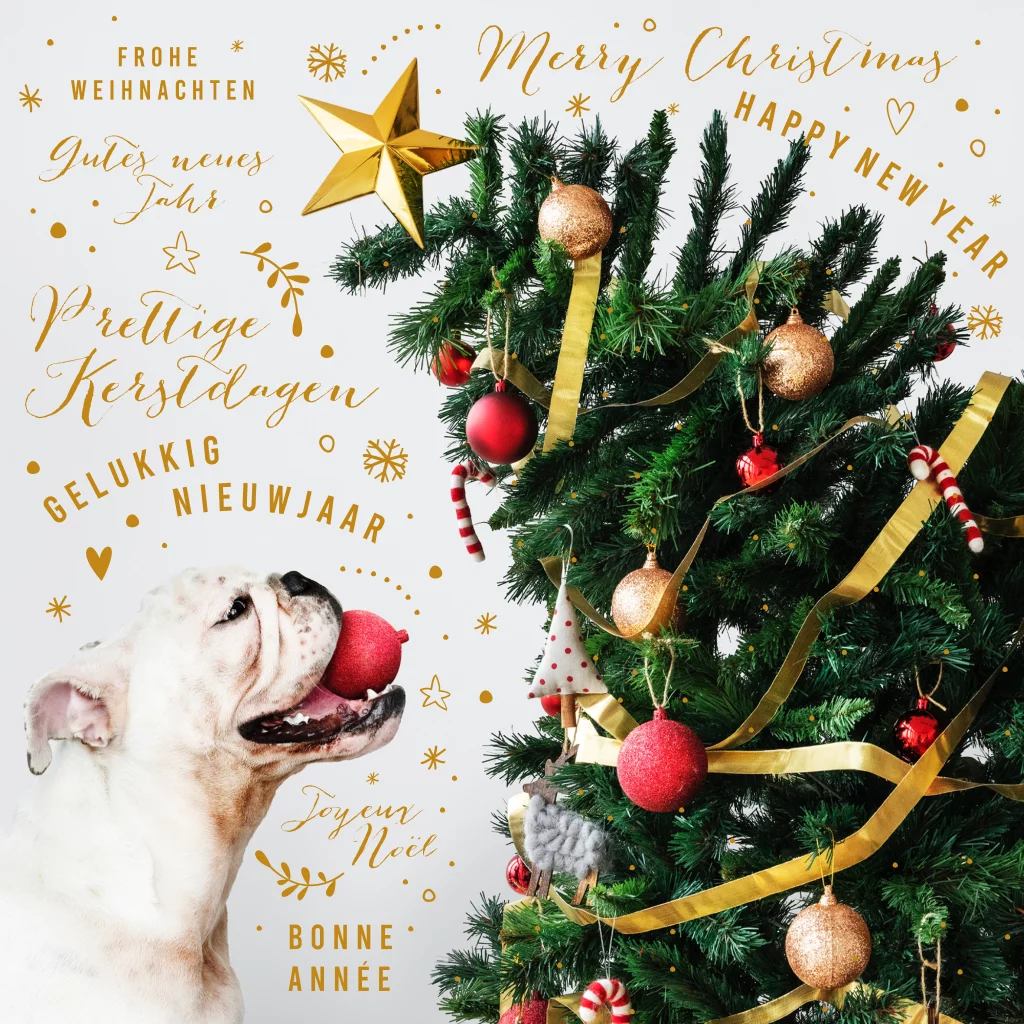 Grappige kerstkaart met hond en kerstboom. Personaliseer de binnenkant van de kerstkaart met een feestelijke kerstgroet! Tip: kies een bijpassende envelop.
