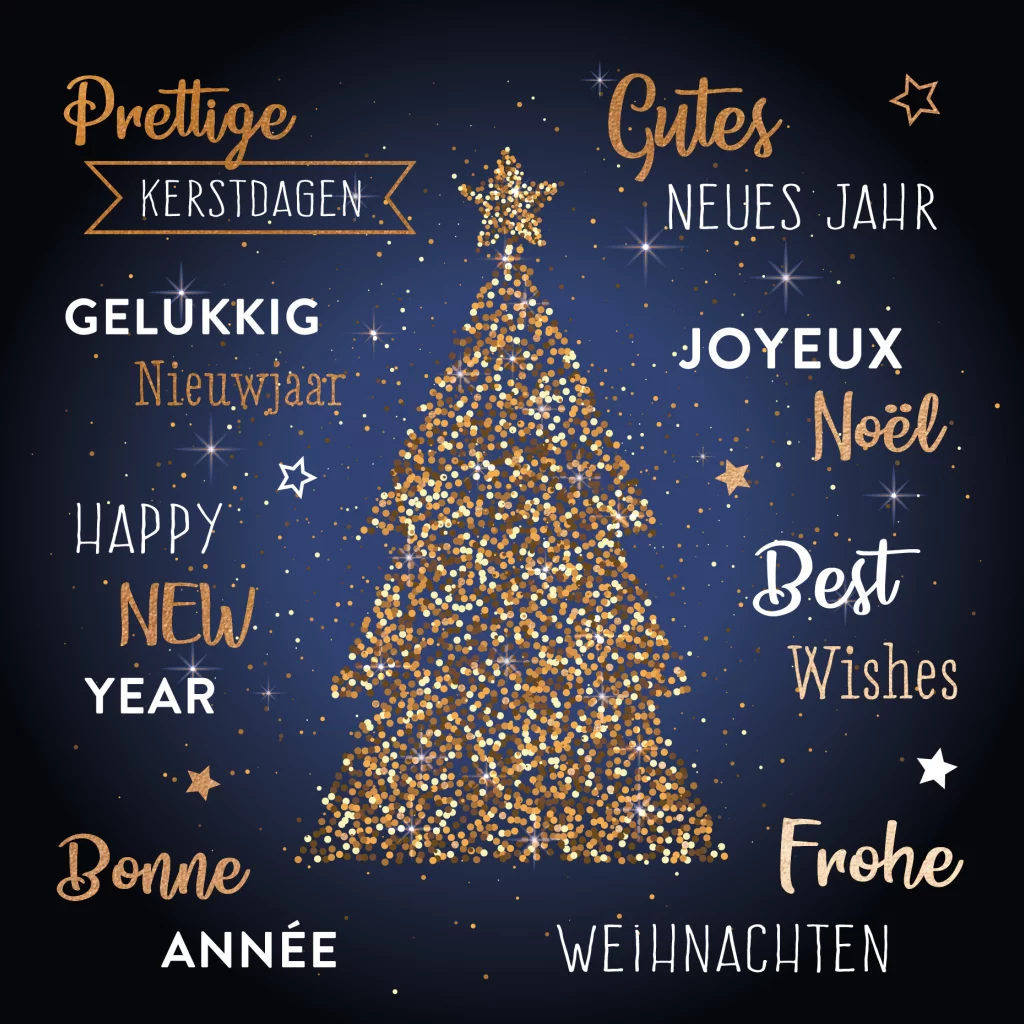 Donkerblauwe kerstkaart met goudfolie look kerstboom en teksten.