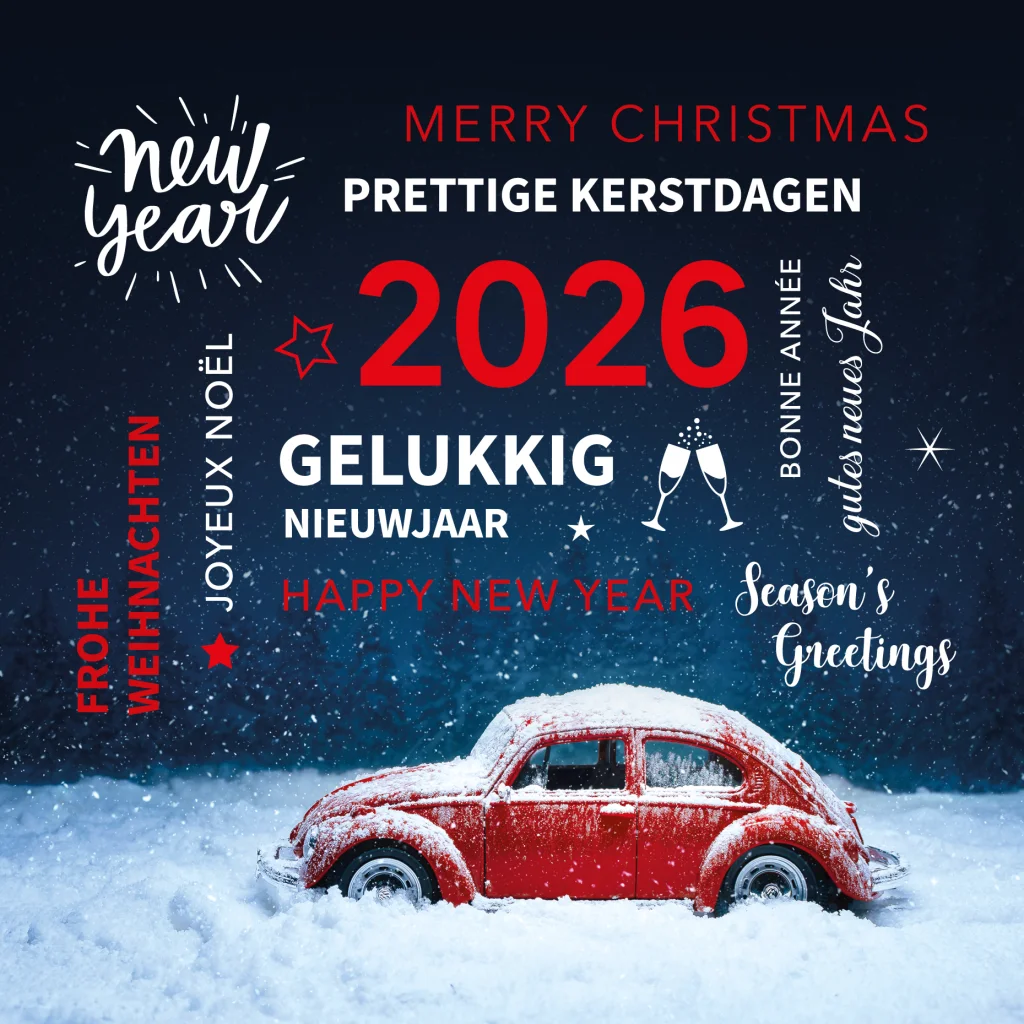 Kerstkaart met oldtimer kever en teksten met jaartal