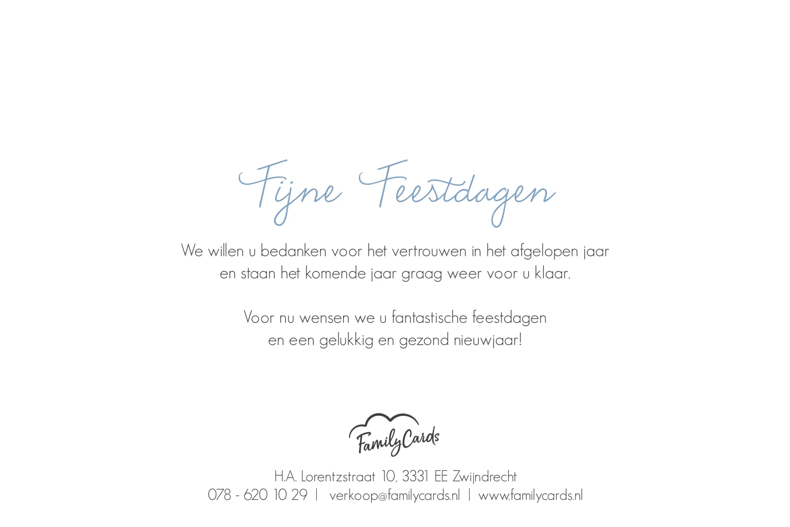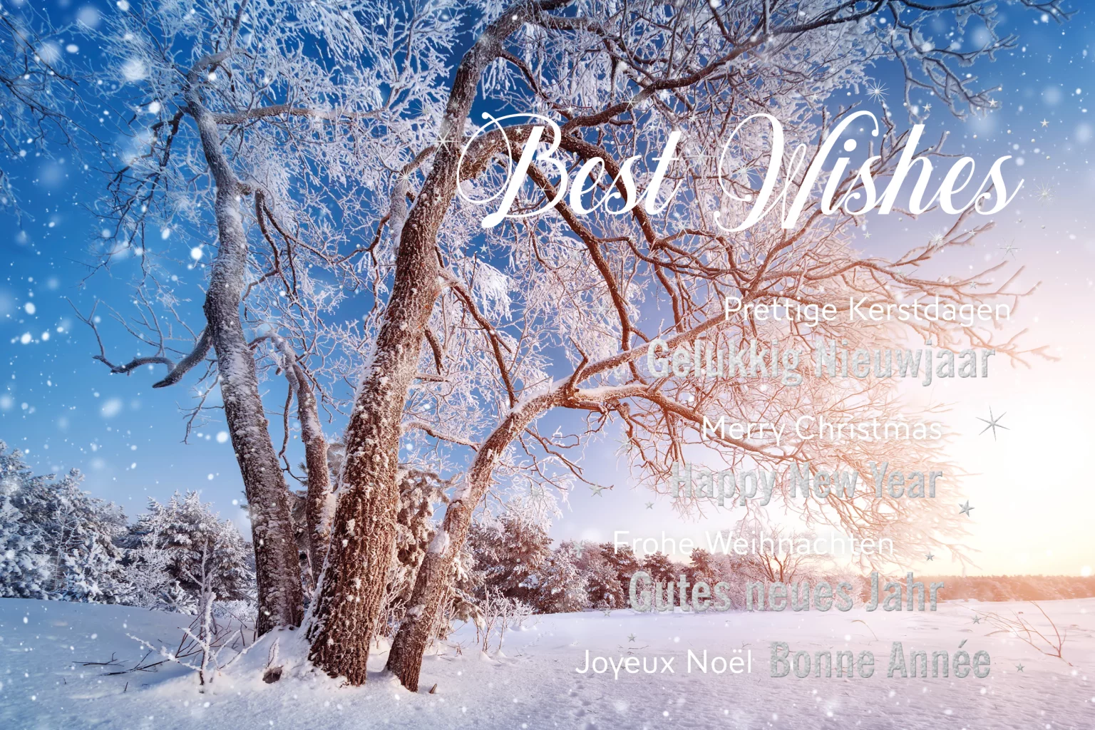 Winterse kerstkaart met landschap en teksten in zilverfolie look.