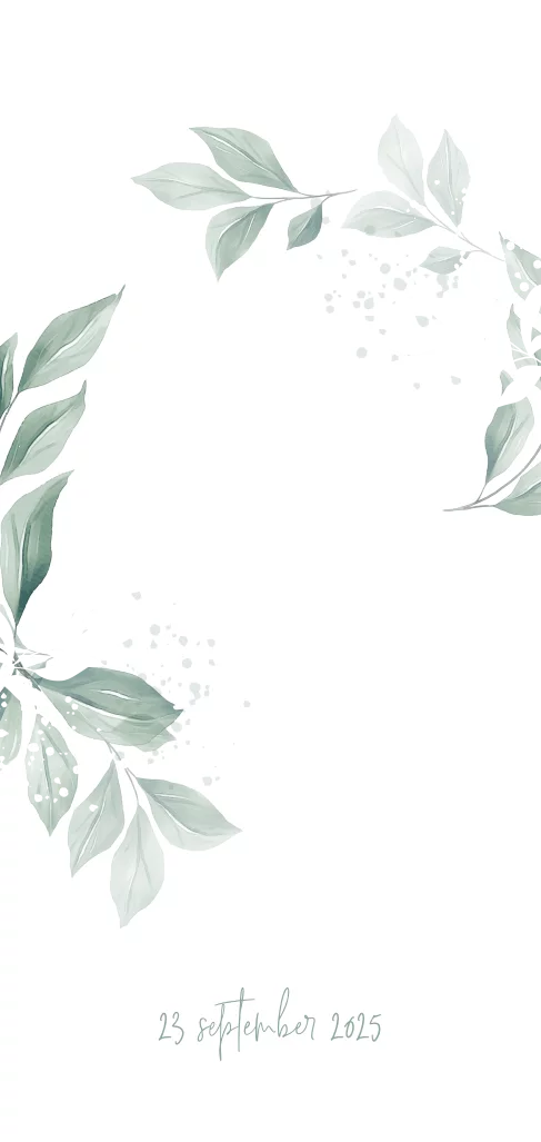 Stijlvolle staande trouwkaart met groene blaadjes en goudfolie. Let op: Deze kaart heeft een langere verzendtijd: voor 18.00 uur besteld = de volgende werkdag gedrukt en verzonden. Minimale bestelhoeveelheid: 5 stuks.