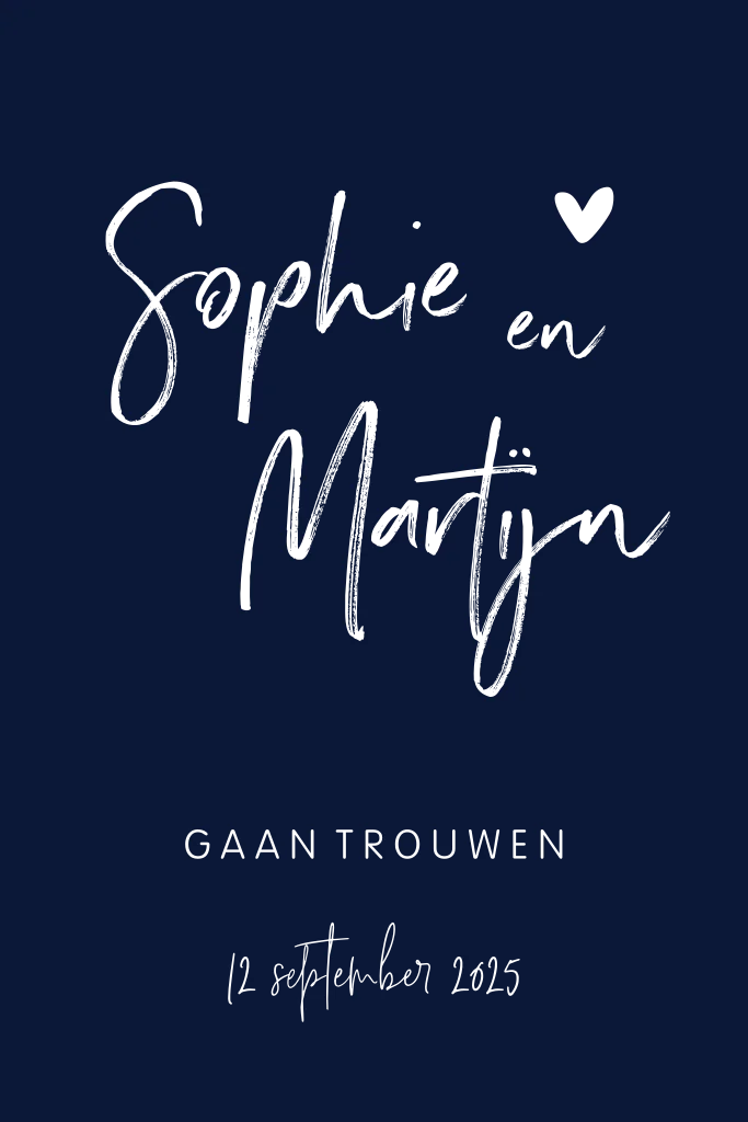 Trouwkaart donkerblauw met minimalistische opmaak in goudfolie. Liever toch koper- of zilverfolie? Je kunt dit gemakkelijk zelf aanpassen door op de naam te klikken en bij kleur de folie te kiezen die je wilt. Let op: Deze kaart heeft een langere verzendtijd: voor 18.00 uur besteld = de volgende werkdag gedrukt en verzonden. Minimale bestelhoeveelheid: 5 stuks.