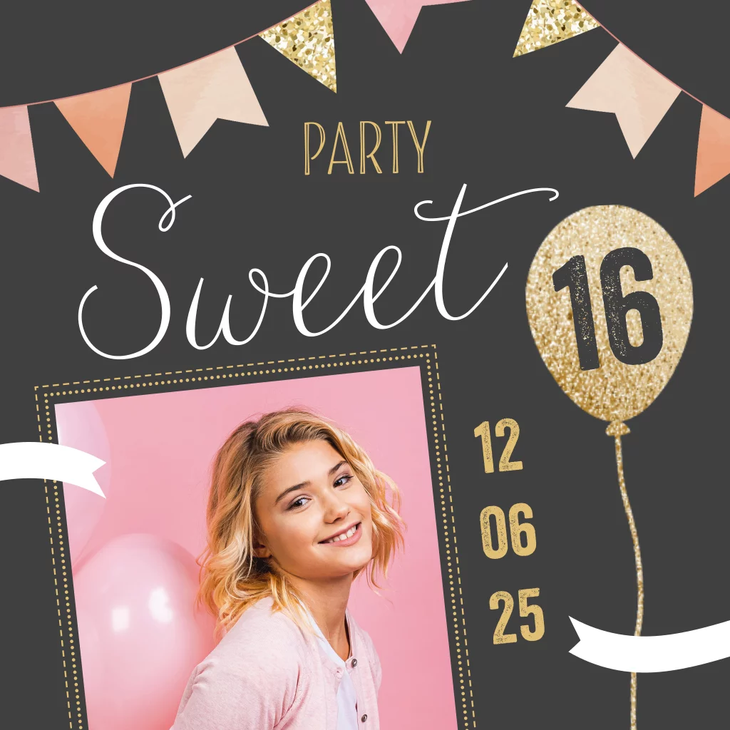 Uitnodiging voor verjaardag met eigen foto en slingers.