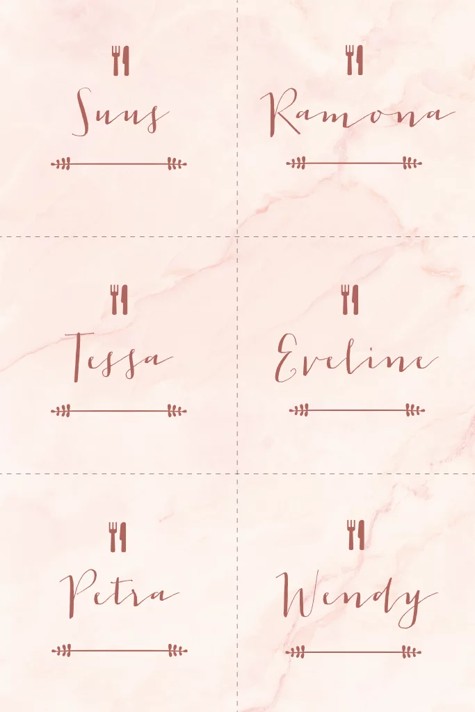 21 diner tafelkaartjes met roze marmer achtergrond