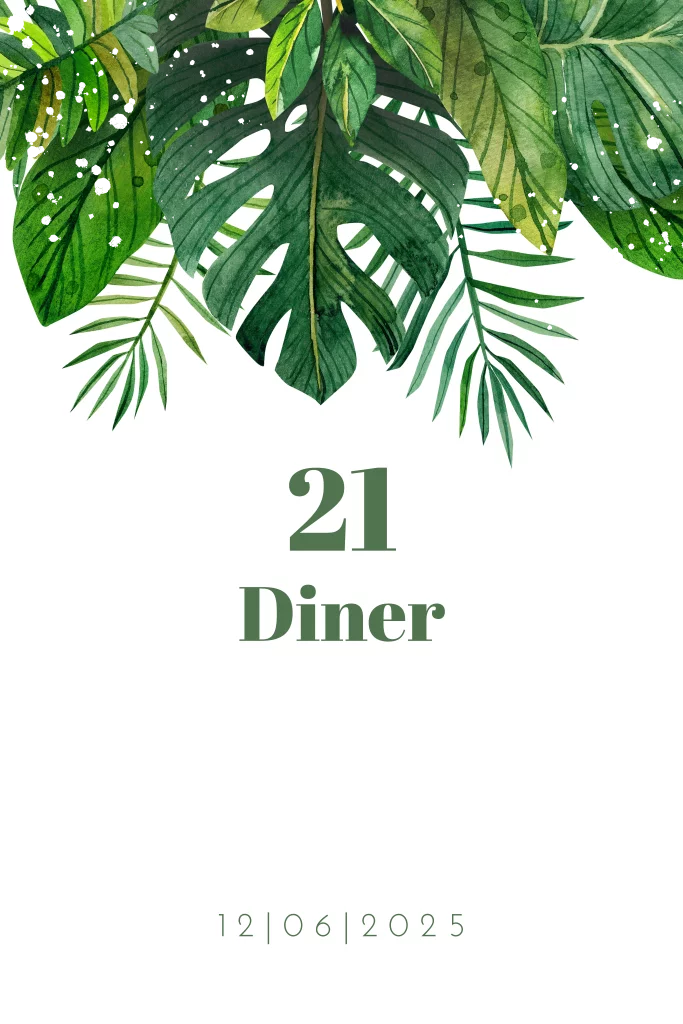 Opzoek naar een chique menukaart voor op jouw 21 diner tafel? Dan ben je bij FamilyCards aan het juiste adres! Deze 21 diner uitnodiging met botanisch thema en folie is een prachtig ontwerp. Wil je liever een andere foliekleur? Of liever helemaal geen folie? Pas dit dan eenvoudig aan via de editor. Let op: Deze kaart heeft een langere verzendtijd: voor 18.00 uur besteld = de volgende werkdag gedrukt en verzonden. Minimale bestelhoeveelheid: 5 stuks.