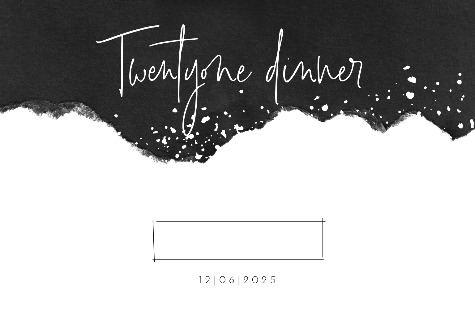 Uitnodiging 21 diner met black and white thema. Let op: Deze kaart heeft een langere verzendtijd: voor 18.00 uur besteld = de volgende werkdag gedrukt en verzonden. Minimale bestelhoeveelheid: 5 stuks.