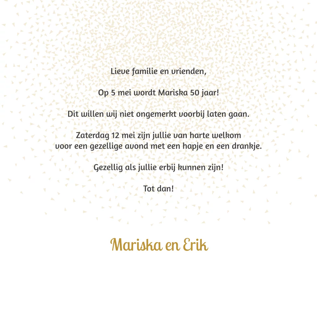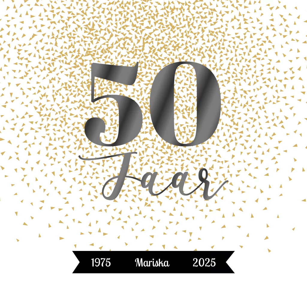 Uitnodiging 50 jaar met zwarte folie en confetti. Let op: Deze kaart heeft een langere verzendtijd: voor 18.00 uur besteld = de volgende werkdag gedrukt en verzonden. Minimale bestelhoeveelheid: 5 stuks.