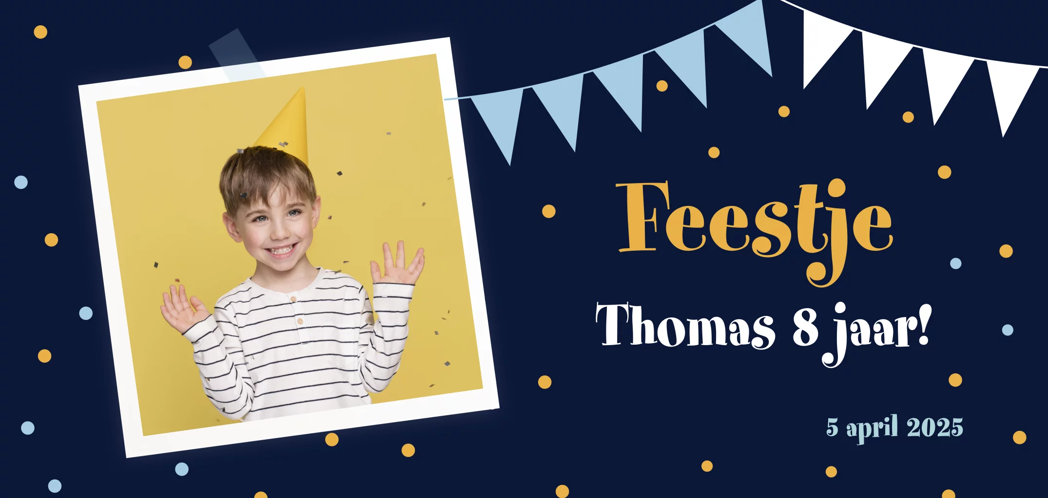 Enkele uitnodiging voor verjaardag met eigen foto voor een jongen.