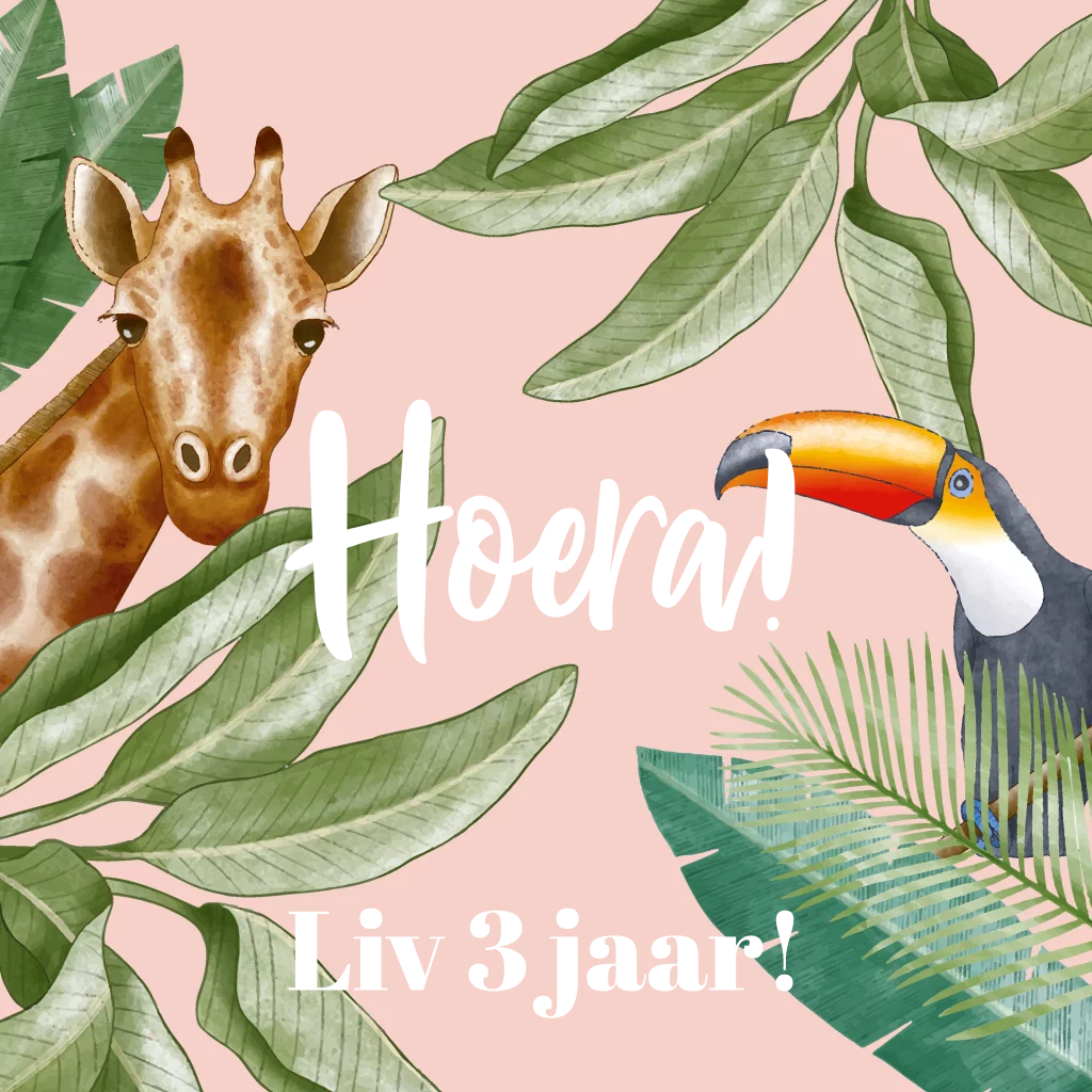 Uitnodiging voor een kinderfeestje met jungle dieren botanisch in goudfolie. Liever toch koper- of zilverfolie? Je kunt dit gemakkelijk zelf aanpassen door op de naam te klikken en bij kleur de folie te kiezen die je wilt. Let op: Deze kaart heeft een langere verzendtijd: voor 18.00 uur besteld = de volgende werkdag gedrukt en verzonden. Minimale bestelhoeveelheid: 5 stuks.