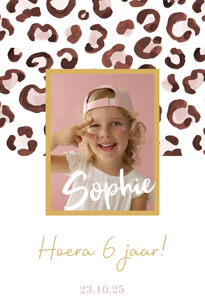 Hippe uitnodiging voor een kinderfeestje met panterprint en een eigen foto.