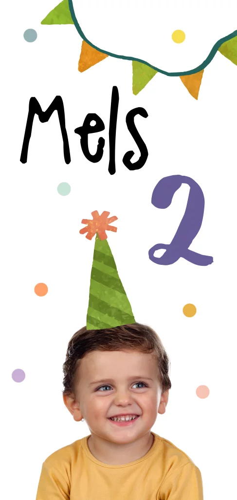 Uitnodiging voor verjaardag met eigen foto en feestmuts.