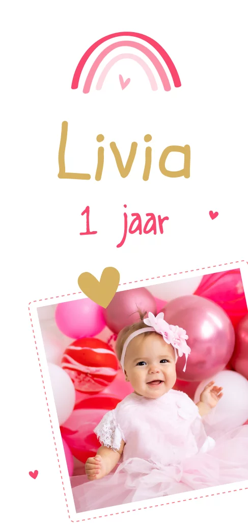 Uitnodiging voor verjaardag met foto en regenboog in roze