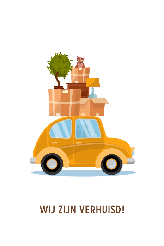 Verhuiskaart gele auto met dozen. De kaart is enkel en heeft ronde hoeken.